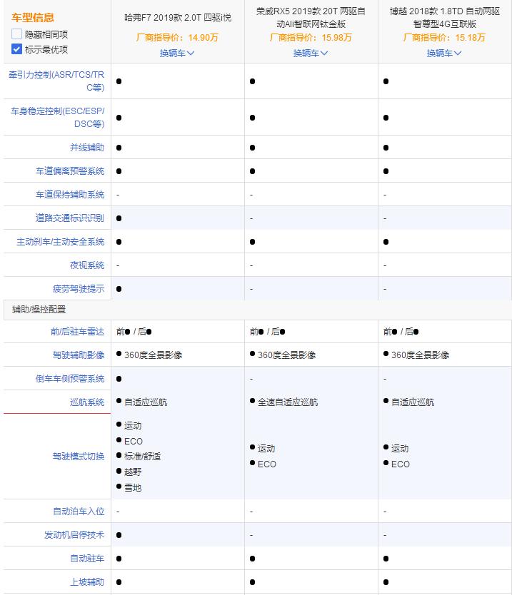 18款博越在主动安全配置方面作了提升,虽然配置也相对齐全,但仅有两种驾驶模式相较于哈弗F7的六种驾驶模式就稍显逊色了。哈弗F7的六种驾驶模式为同级别车型中独有,能适应网友出去郊游时对不同路况的需求。下面我们就选取3个品牌价格相似的3款车型对智能科技配置作下对比,看看谁最具有“加量不加价”高性价比属性。