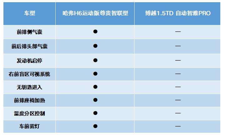 然后对比的是功能配置,首先合资车日产逍客被第一个排除,因为逍客的配置要和博越、哈弗H6运动版在同一水准上,售价要15万往上,严重超支。然后,在博越和哈弗H6运动版两者之间,后者多有发动机启停、转向辅助灯、雾灯等配置,日常用车的便利性自然更胜一筹,同时多这么些功能也更加划算。