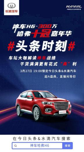 经过了解,原来是哈弗品牌为庆祝旗下神车哈弗H6全球销量突破300万辆、为回馈全球用户,特推出的“神车H6 300万 哈弗十冠嘉年华”直播盛典月活动。六大惊喜十重礼遇福利丰厚,据悉活动将于3月27日在今日头条&水滴汽车中的直播作为起点,并带领用户向“弗”礼发起总攻!