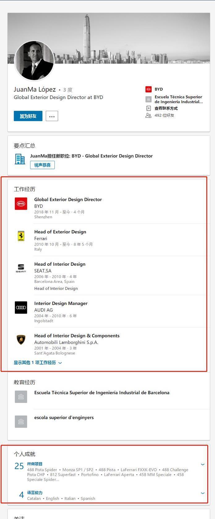 从领英网的公开资料来看,洛佩慈已经在 2018 年 11 月份正式工加入了比亚迪,职位是全球外饰设计总监(Global Exterior Design Director ),至今已经有 4 个月的时间。而他的履历也是非常的丰富,加入比亚迪之前是在法拉利任职,职位是外饰设计总监;此外还在西雅特、奥迪以及兰博基尼等任职过。