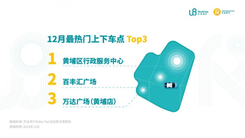 截至目前,文远粤行Robo-Taxi上下车点已由运营初期的三十几个扩充到百余个,增加两倍多,并且仍在持续添加中,覆盖运营区域内的商场、行政办公场所、大型小区、地铁、公交站点等热门叫车位置。运营报告显示,目前运营区域内最热门的前三个上下车点分别为:黄埔区行政服务中心、百丰汇广场、万达广场(黄埔店)。