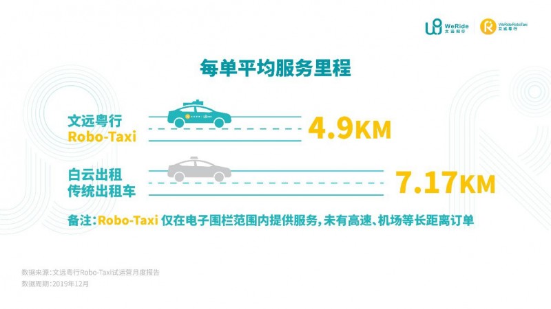 单个用户平均每天的叫车次数为1.8次,每单平均服务里程为4.9公里。作为对比,白云出租的传统出租车在12月份的每单平均服务里程为7.17公里。Robo-Taxi仅在电子围栏范围内提供服务,未有高速、机场等长距离订单,与传统出租车的正常运营水平比较接近。