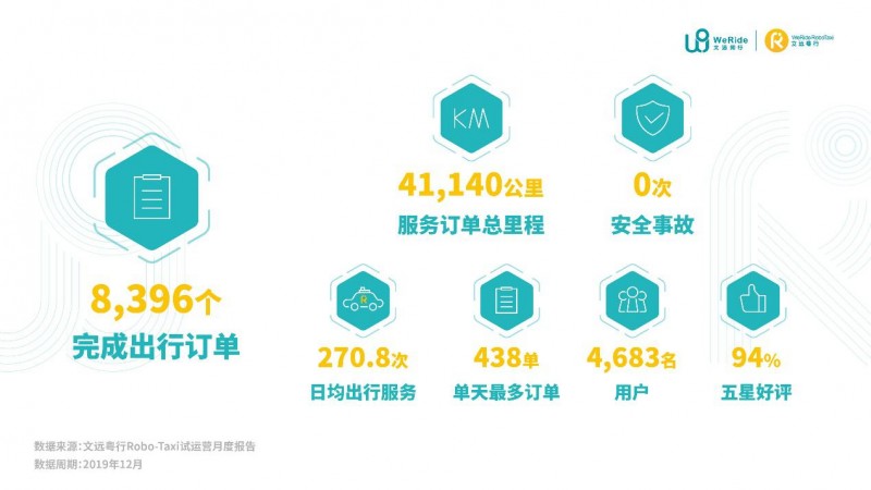 2020年02月14日 中国 广州) 文远知行WeRide携旗下合资公司文远粤行发布中国首份L4级自动驾驶出租车Robo-Taxi的试运营报告。文远粤行试运营首月,即2019年12月01日至31日,共完成8,396个出行订单,零安全事故,日均出行服务270.8次,单天最多订单达到438单,服务订单总里程达41,140公里,共服务4,683名用户。