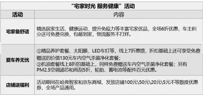 而一些特殊行业早已开始复工,针对有用车需求的老用户2月20日-3月20日期间,在哈弗智家APP及京东长城汽车官方旗舰店特别推出“宅家时光,服务健康”活动,包括低价车品,免费赠送杀菌套餐等,在这个特殊时期,为用户提供最贴心的用车服务解决方案