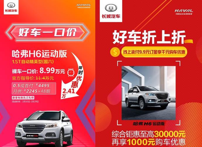 而在汽车之家、苏宁以及易车哈弗旗舰店等平台,哈弗则针对哈弗H6运动版手动精英型、自动尊贵智联型奉上“好车折上折”等玩法多样、优惠多多的购车活动,至高钜惠可达到30000元,并且只需支付9.9元定金,即可额外享受1000元限时购车优惠。