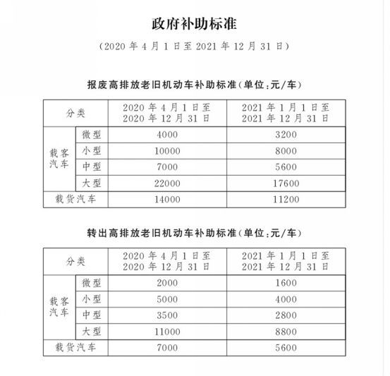 2020年3月30日,北京市人民政府办公厅印发了《北京市进一步促进高排放老旧机动车淘汰更新方案(2020-2021年)》,为进一步加快本市高排放老旧机动车淘汰更新步伐,降低机动车污染物排放,持续改善首都空气质量,在2020年4月1日至2021年12月31日期间,报废或转出本市的高排放老旧机动车可享受政府补助。