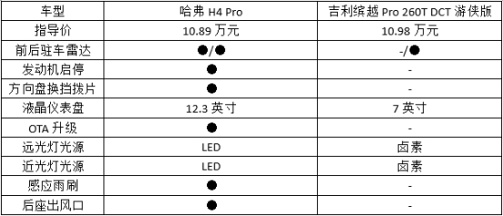 具体到车型方面,此次对比选取“哈弗H4 Pro”和“吉利缤越Pro 260T DCT游侠”两款车型进行对比。这两款车均为高配版,且售价相差无几(指导价分别为:10.89万元&10.98万元)符合当下年轻消费者的大致购车预算。