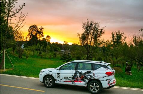 在去往村落的路上,正好是傍晚,天空中出现大片火红的晚霞和落日余晖融为一体,此时上一站涂鸦的M6正行驶在上行的坡路上,我们的摄影师拍下这一幕,M6完美上扬的侧身腰线显得淋漓尽致,车身轮廓线在后车窗处向上转折,提升了侧方的视觉效果,与悬浮车顶、个性的前脸相互呼应,充满运动气息。而车身的时尚个性的涂鸦在空中晚霞的映衬下让M6散发出热情似火活力。