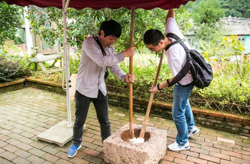 糍粑也称年糕,以糯米,土豆为主料,口感香甜。打糍粑是土家族人流行的“过年”习俗,他们人有”二十八,打粑粑”的说法。平日里有喜事,当地人也要做红糖拌糍粑招待客人,是吉利的寓意。糍粑由糯米蒸熟再通过特质石材凹槽冲打而成,手工打糍粑一项劳动强度很大的活,一般都是男子汉打,两个人对站,先揉后打,即使冰雪天也要出一身汗,这次活动特意体验后的几个小伙子也是衣衫浸透汗水,着实是不容易呢。但是做出来的糍粑柔软细腻,味道极佳。做粑粑也很讲究,手粘蜂腊或茶油,先出砣,后用手或木板压,要做得玉圆光滑,讲究美观。