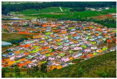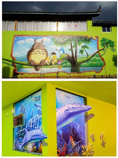 玫瑰小镇是亚洲第一个彩色村庄、第一个玫瑰爱情主题小镇。小镇上共有442栋传统庭院房屋,刷成了9种颜色。而其中最具特色的就是各式艺术涂鸦和3D墙画。据说,小镇里的3D墙画有8000多平方米,让这个彩色的村落更添一份灵动。