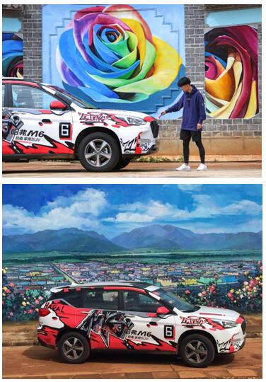 被这些生动的绘画涂鸦所感染,我们也请画师以热情似火的玫瑰作为元素为M6画上了浪漫的涂鸦,在九色玫瑰墙前留下了帅气的身影。