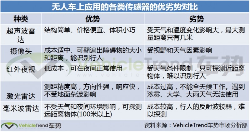 自动驾驶汽车采用的是民用级的毫米波雷达,车载毫米波雷达测距具备有探测性能稳定的特点。毫米波雷达不易受对象表面形状、颜色以及大气流的影响,具有环境适应性能好的特点,在雨、雪、雾等环境下也能较好运行。以下为各类传感器产品优劣势对比图: