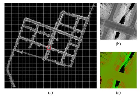 上图为百度的激光雷达点云定位地图。首先要提前制作一幅无人车将要行驶地区的激光雷达点云定位地图,包含有激光雷达强度成像图和高度分布图,这张图通常是地图厂家用测绘级激光雷达完成的。目前全球绝大多数厂家包括Waymo、福特、通用等都是如此。b为激光雷达反射强度成像图,c为高度分布图。这张图覆盖范围3.3*3.1平方公里。