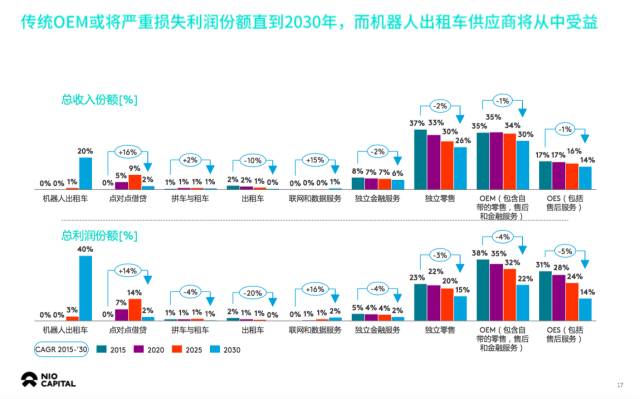 最明显的是机器出租车,根据粗略分析,从收入到利润情况都会占据相当大规模,但是出行市场其实也有很多其他的机会,哪怕是一个很小的细分市场,也有可能会出现行业里面的小巨头,包括P2P租车、拼车,还有车联网以及数据服务。