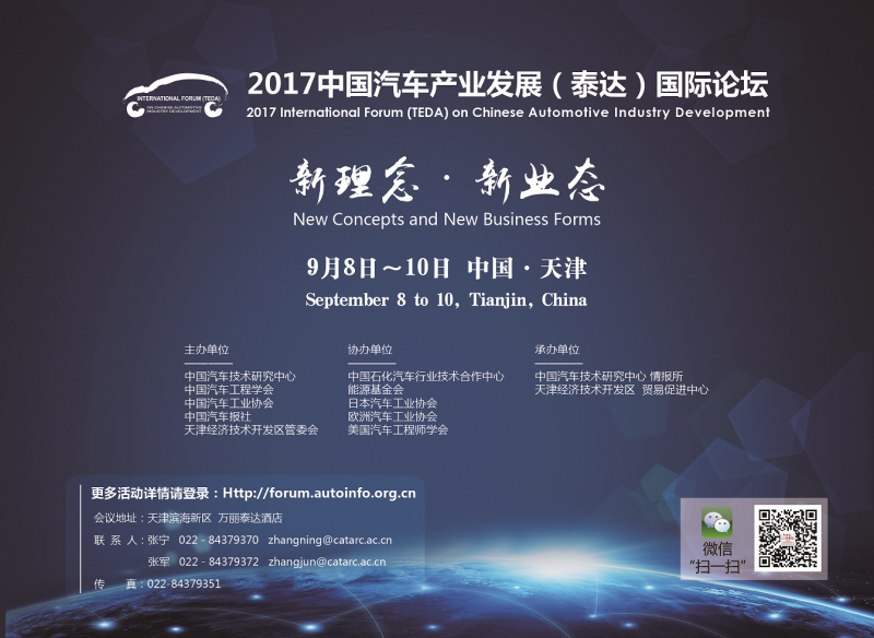 而今,2017年泰达汽车论坛的号角再次吹响,泰达汽车论坛又一次责无旁贷的高举促进汽车产业可持续发展的大旗,紧跟《规划》中对汽车产业发展的指导思想,秉持“新理念”,透析“新业态”,希望能集聚产业发展的先锋力量,共同为汽车产业落实“创新、协调、绿色、开放、共享”的全新发展理念,提升汽车产业创新水平出谋划策,并引导汽车产业在五大新理念的引领下走向更为深刻的变革。